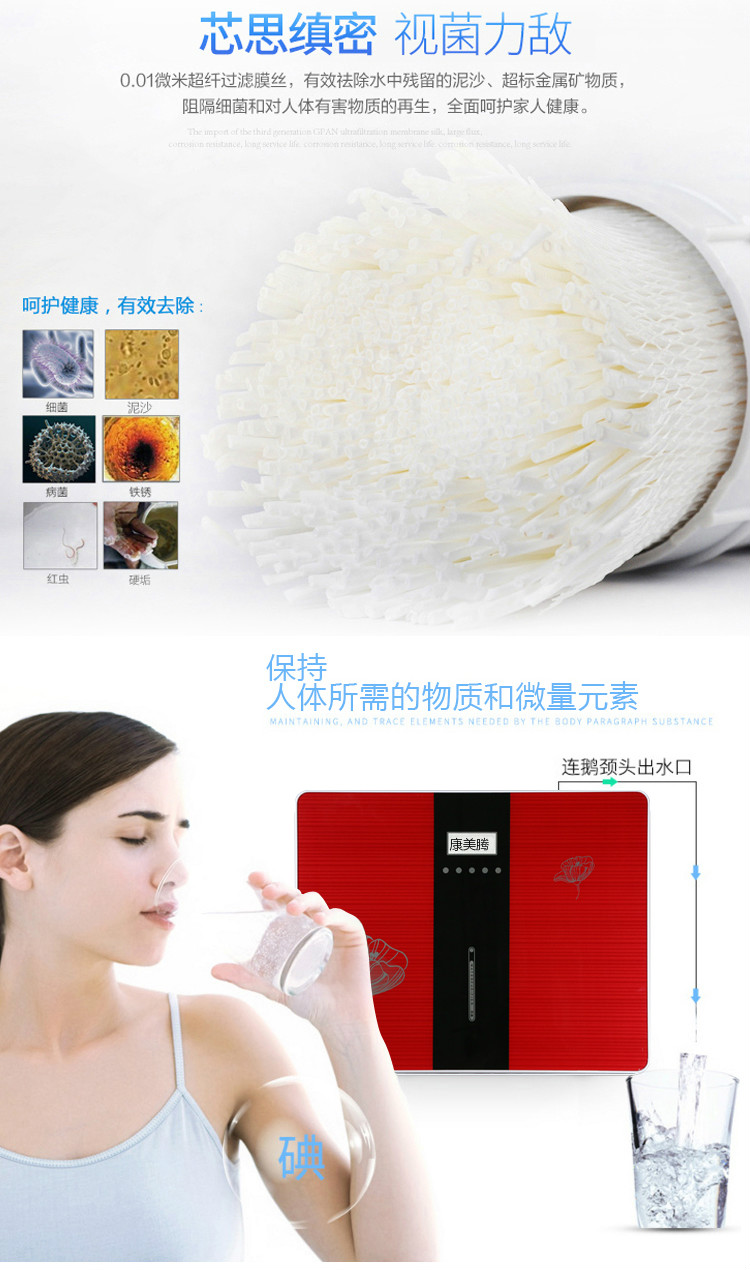 功能(néng):采用(yòng)現(xiàn)代過濾新技(jì)術(shù)—中空(kōng)纖維超過濾技☆(jì)術(shù),濃縮和(hé)分(fēn)離(lí)自(zì)來(lái)水(shuǐ)中的(de)大(dà)分 (fēn)子(zǐ)物(wù)質或膠體(tǐ)物(wù)質,過濾精度為(wèi)0.01微(wēi)米,能(néng)高(gāo)效去(qù)除水(shuǐ)中的(de)大(dà)分(βfēn)子(zǐ)的(de)超微(wēi)粒子(zǐ)、熱(rè)源體(tǐ)、病毒、細菌(大(dà)腸¥杆菌、霍亂菌、痢疾菌等),有(yǒu)效的(de)去(qù)除細菌達99.9%,徹底清除高(gāo)分(fēn)子(zǐ)、有(yǒu)機(jΩī)物(wù)、更深層次降低(dī)濁度、使飲水(shuǐ)更衛生(shēng)、更安全。