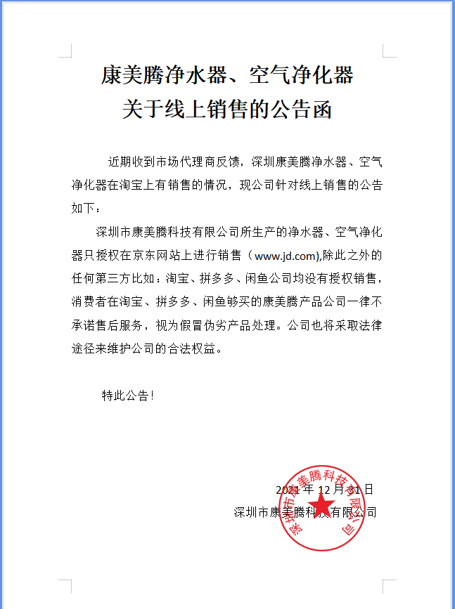 - 康美(měi)騰産品關于線上(shàng)銷售公告函