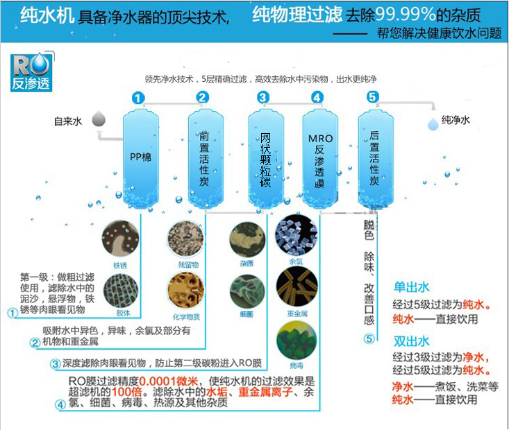 第四級:RO反滲透膜:孔徑0.0001微(wēi)米,有(yǒu)效清除水(shuǐ)中病毒、重金(jīn)屬等有(yǒu)機(j←ī)雜(zá)質。